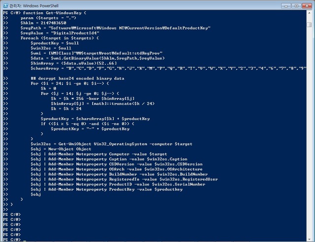3.4 Get-WindowsKey 커맨드로 CD-Key확인. 이상 끝.